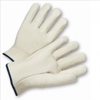 Select grain cowhide leather driver glove. Straight thumb construction is ideal for closed fisted work. Shirred elastic wrist helps keep dirt and debris out of the glove. Cotton hem is color coded for easy size identification.